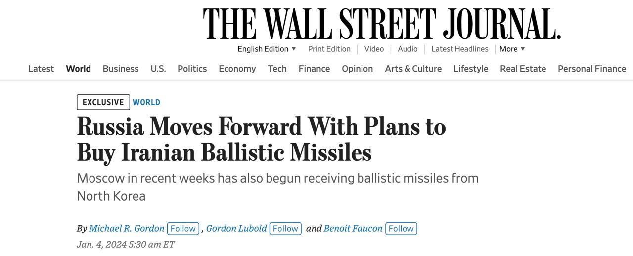 Ранее сегодня The Wall Street Journal сообщил, что Россия в последние недели получила от КНДР несколько десятков баллистических ракет.