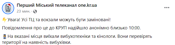В Кривом Роге поступило анонимное сообщение о минировании всех торговых центров и вокзалов.