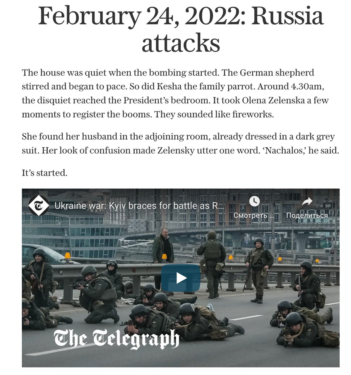 В 4.30 утра, когда началась бомбежка, Зеленская застала супруга в соседней комнате, уже одетого в темно-серый костюм. Ее растерянный вид заставил Зеленского произнести одно слово: "Началось".