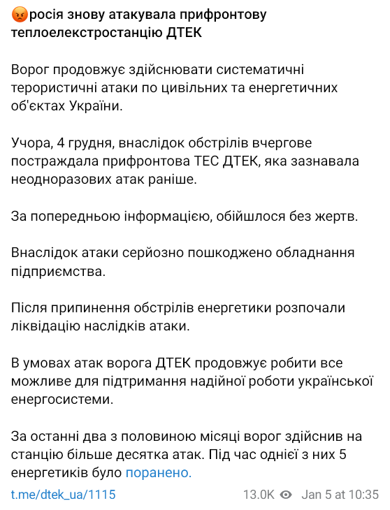РФ атаковала теплоэлектростанцию ДТЭК в прифронтовой зоне, которая более 10 раз подвергалась обстрелам