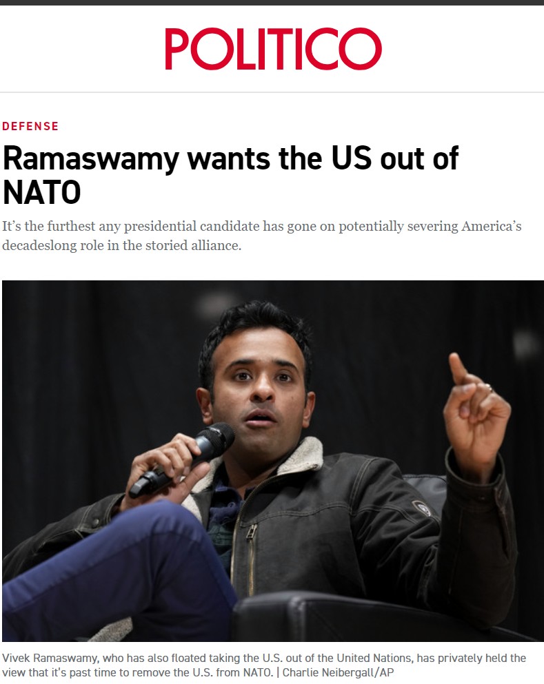 Кандидат от Республиканской партии Вивек Рамасвами заявил, что в случае победы на выборах выведет США из НАТО.
