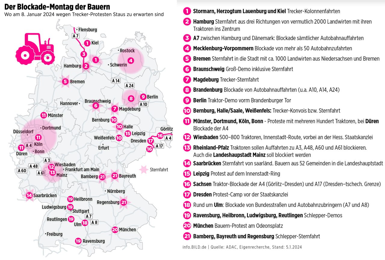В связи с мероприятием ФРГ ожидает транспортный коллапс. О своем участии в нем заявили 3500 человек, она будет включать медленный проезд колонн сельскохозяйственных тракторов и грузовых автомобилей по трассам A14, A19, A20 и A24, блокировку въездов на автотрассы и автопробеги по крупным городам.
