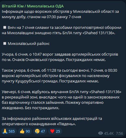 В ночь на 7 января силами и средствами противовоздушной обороны в Николаевской области уничтожены пять БПЛА типа "Shahed 131/136". Также один из "Шахедов" попал по базе отдыха.