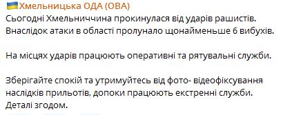В Хмельницкой области во время ракетной таки РФ с утра было по меньшей мере шесть взрывов.
