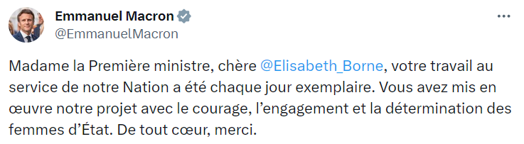 В своем сообщении Макрон поблагодарил Элизабет Борн за проделанную работу.