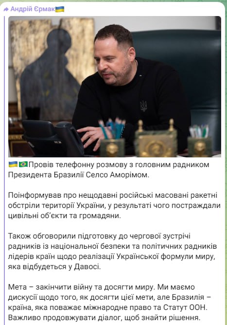 Об этом Ермак сообщил по итогам телефонного разговора с главным советником президента Бразилии Селсо Аморимом.