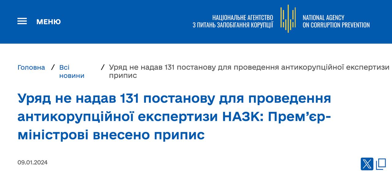 По данным регулятора, за 2023 год Кабмин не направил 131 принятое постановление на антикоррупционную экспертизу НАПК.