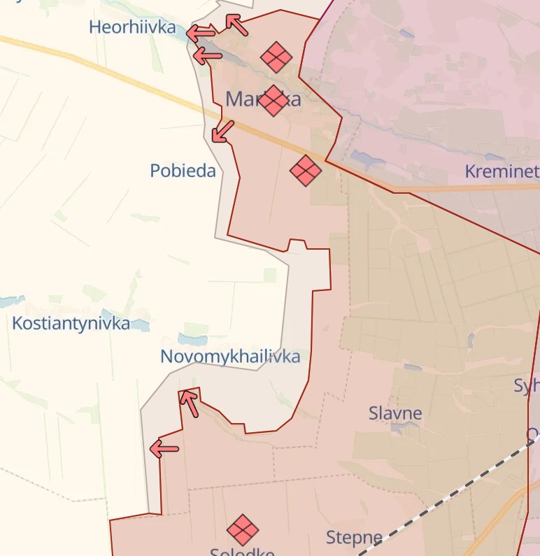 Также, по данным Deep State, россияне наступают в сторону Георгиевки к западу от Марьинки. Российские паблики заявляют о захвате двух церквей в этой деревне.