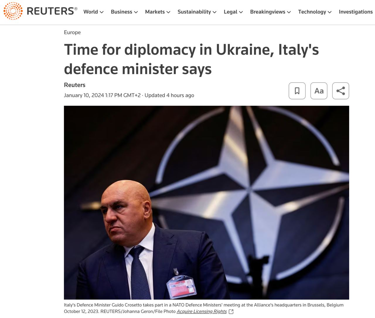 Крозетто заявил парламенту Италии, что украинское контрнаступление 2023 года не принесло желаемого результата, и к военной ситуации следует относиться "реалистично".