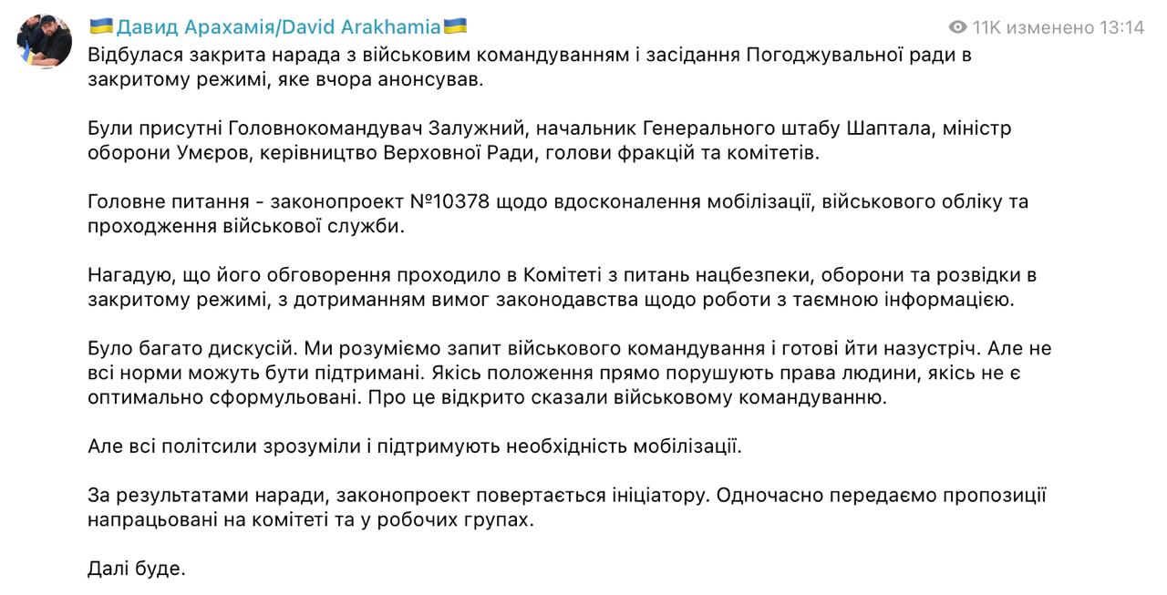 "Было много дискуссий. Мы понимаем запрос военного командования и готовы идти навстречу. Но не все нормы могут быть поддержаны. Какие-то положения прямо нарушают права человека, какие-то не оптимально сформулированы. Об этом открыто сказали военному командованию. Но все политсилы поняли и поддерживают необходимость мобилизации. По результатам совещания законопроект возвращается инициатору. Одновременно передаем предложения наработанные на комитете и в рабочих группах", - пишет Арахамия.