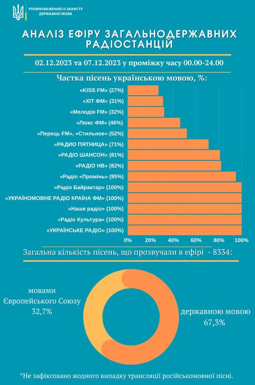 Во время обзора были проанализированы круглосуточные эфиры 2 и 7 декабря 2023 года всех 14 радиостанций, которые в соответствии с решением Национального совета по вопросам телевидения и радиовещания ведут общенациональное радиовещание. Установлено, что из 8334 песен, воспроизведенных в эфире радиостанций в течение двух дней, 5599 исполнены на украинском языке (67,3%), 2732 - на официальных языках Европейского Союза (32,7% ) и три - на грузинском.