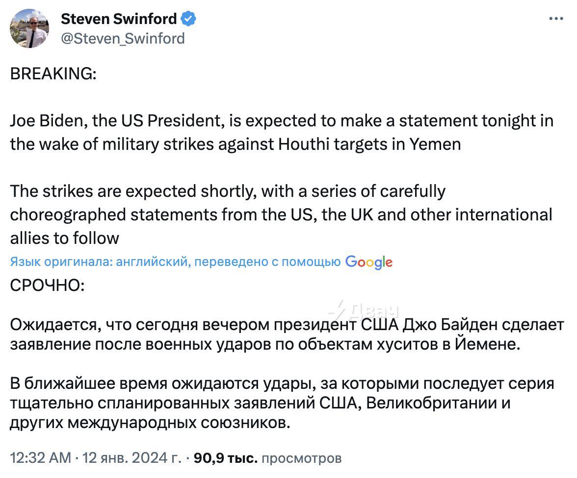 Кроме того, журналист газеты The Times Стивен Суинфорд пишет, что после авиаударов США и Британии по хуситам в Йемене, которые ожидаются сегодня ночью, американский президент Джо Байден выступит с заявлением. Также с заявлениями выступят и союзники США.