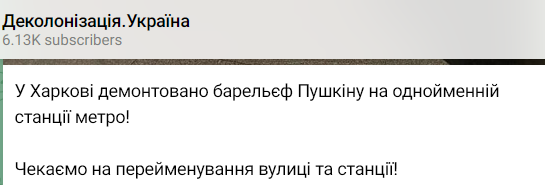 В настоящее время в Харькове еще не переименованы улица Пушкинская и одноименная станция метро.