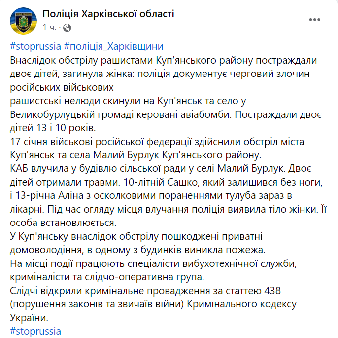 Сегодня российские военные ударили по Купянску и селу Малый Бурлук Харьковской области управляемыми авиабомбами. В результате обстрела погибла женщина, пострадали двое детей 13 и 10 лет.