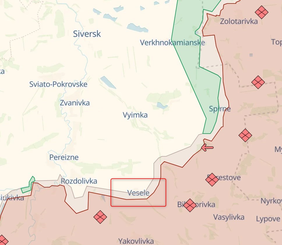 Украина захвата Веселого не подтверждала. Украинский телеграм-канал Deep State пишет, что за последние дни противник имел частичный успех у Белогоровки Луганской области. Это к востоку от Северска.