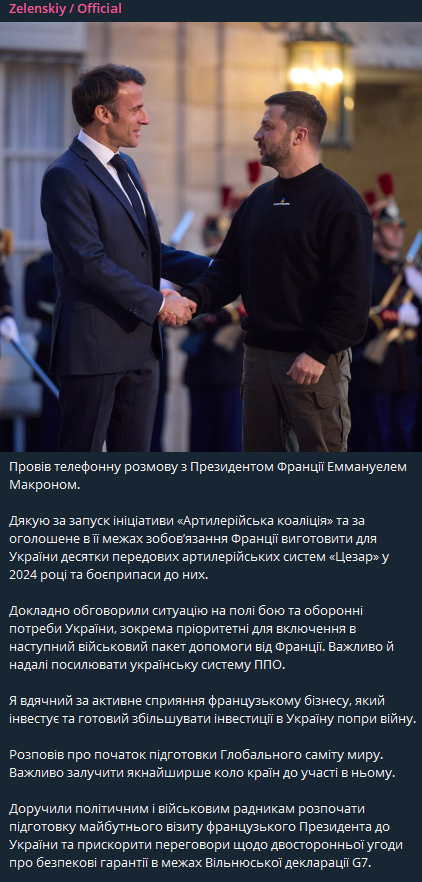 В разговоре Зеленский поблагодарил за запуск инициативы "Артиллерийская коалиция" и за объявленное в ее рамках обязательство изготовить для Украины десятки артиллерийских систем "Цезарь" в 2024 году и боеприпасы к ним.