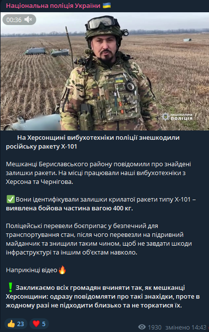 "Жители Бериславского района сообщили о найденных остатках ракеты. На месте работали наши взрывотехники из Херсона и Чернигова. Они идентифицировали остатки крылатой ракеты типа Х-101 – обнаружена боевая часть весом 400 кг" - говорится в сообщении.