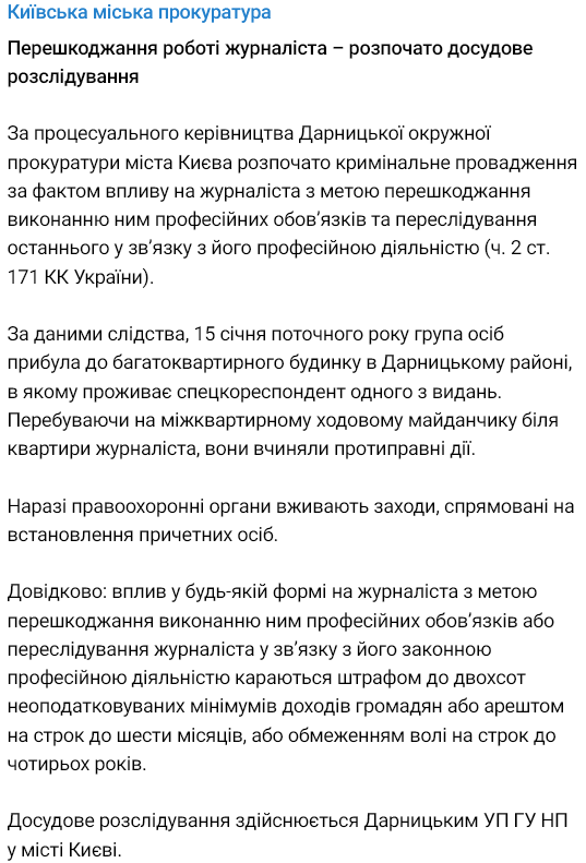Имя корреспондента не называется, но фабула дела узнается по описанию прокуратуры Киева.