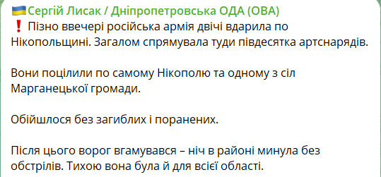 "Поздним вечером российская армия дважды ударила по Никопольщине. В общей сложности направила туда полдесятка артснарядов. Они попали по самому Никополю и одному из сел Марганецкой общины", - написал Лысак.