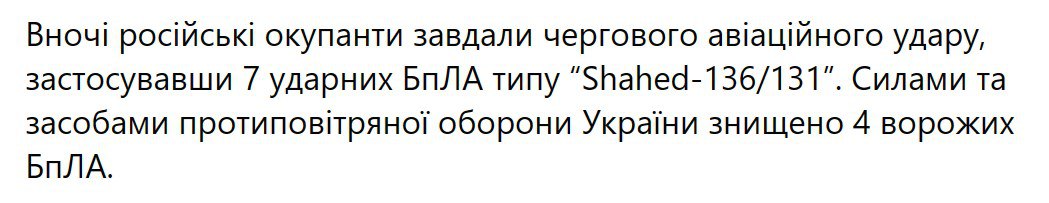 08:48 Ночью по Украине запустили семь "Шахедов", сообщает Генштаб ВСУ.