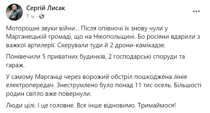 "Россияне ударили из тяжелой артиллерии. Направили туда и 2 дрона-камикадзе. Повреждены 5 частных домов, 2 хозяйственные постройки и гараж.