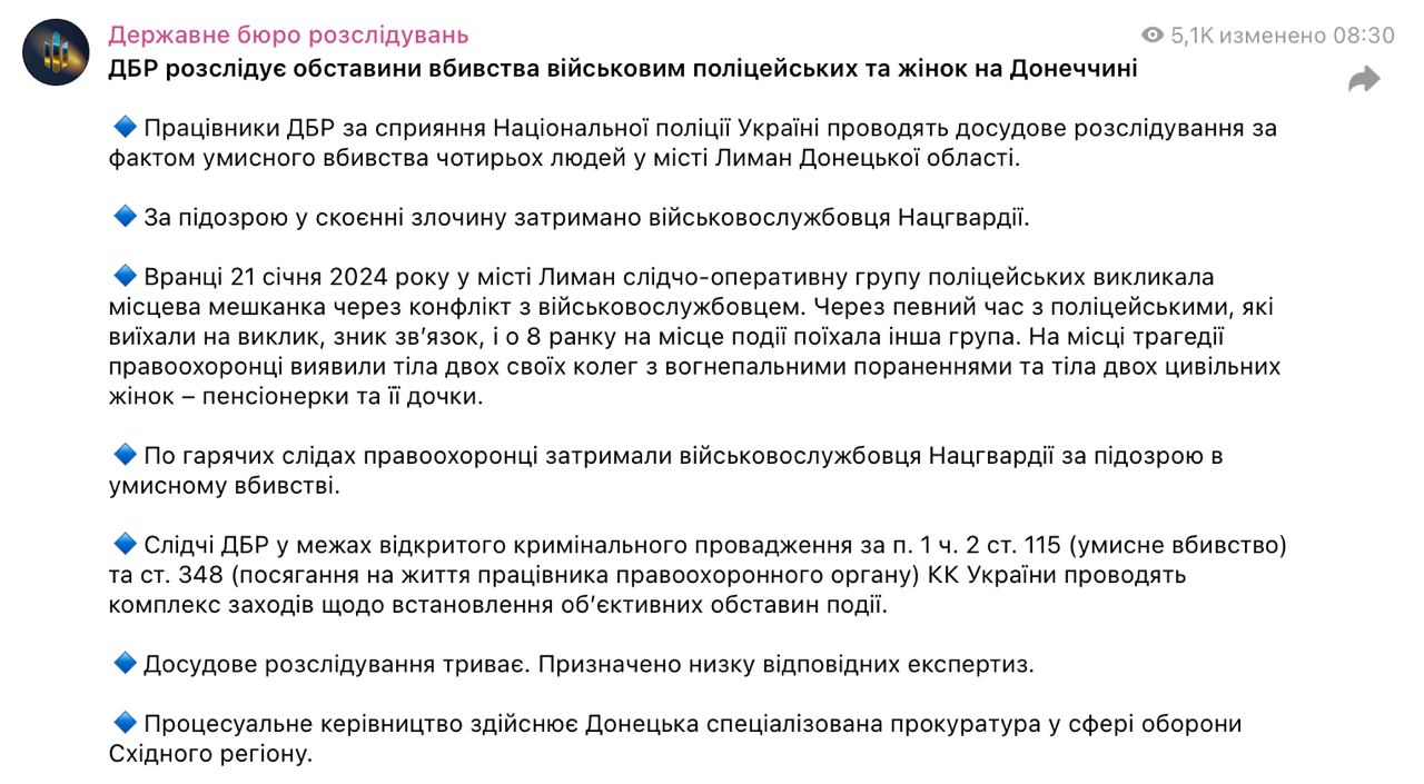В Лимане нацгвардеец убил четырех человек - двух женщин и двух полицейских, которые приехали по вызову.