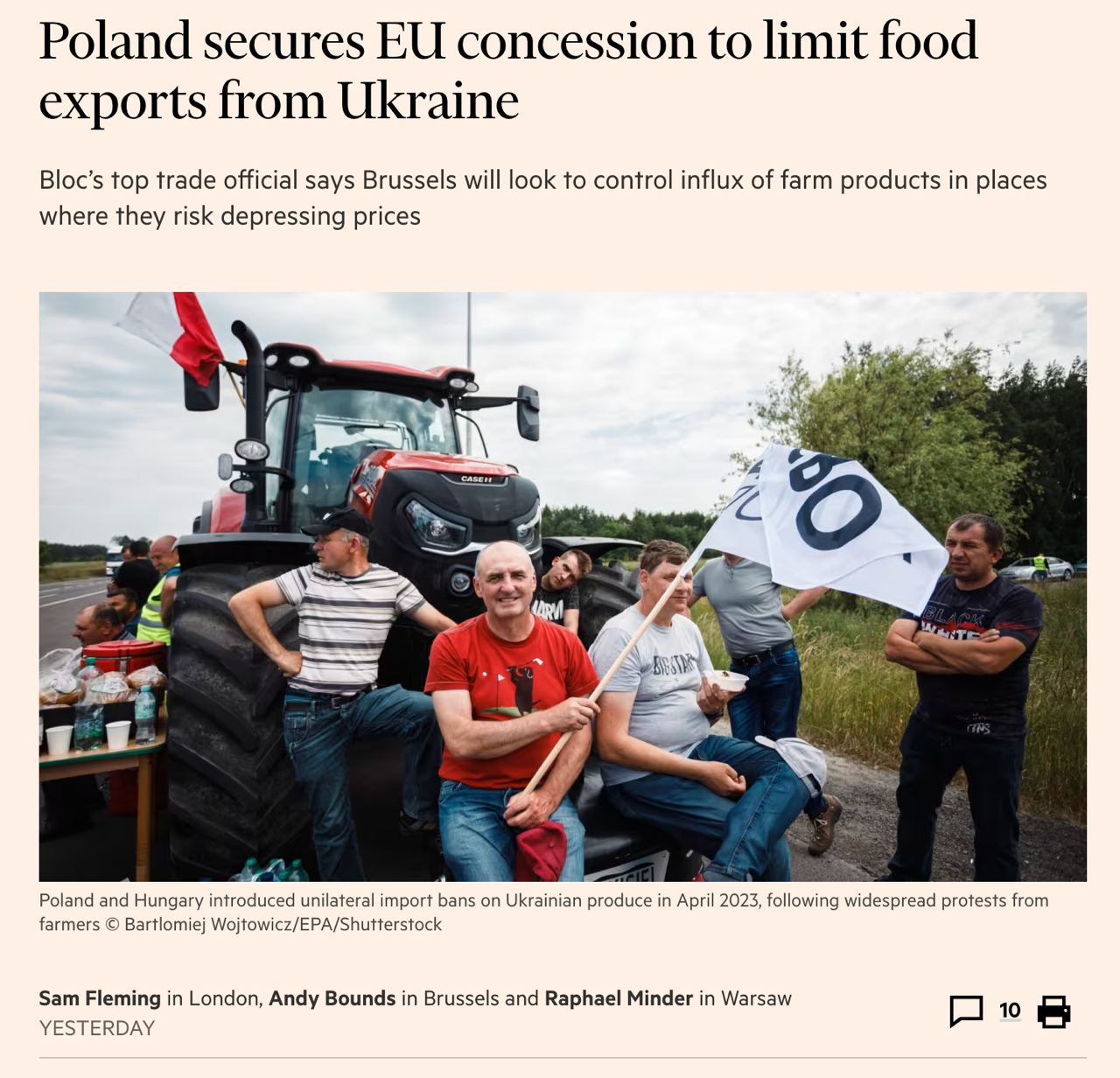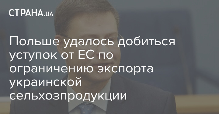 Польша добилась уступок от ЕС по ограничению экспорта украинской сельхозпродукции. Торговый комиссар ЕС Валдис Домбровскис заявил, что Брюссель начнет блокировать импорт из Украины, если рынок конкретной страны будет переполнен, что создаст риск снижения цен.