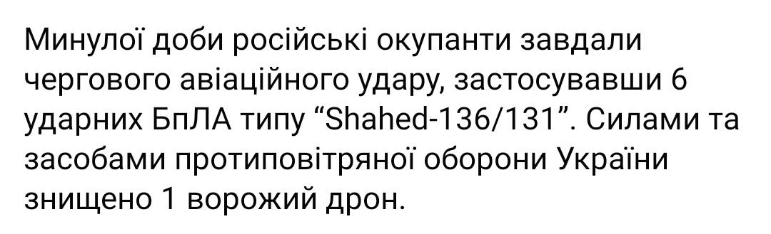 За прошедшие сутки российские оккупанты нанесли очередной авиационный удар, применив 6 "Шахедов", был уничтожен 1 вражеский дрон.