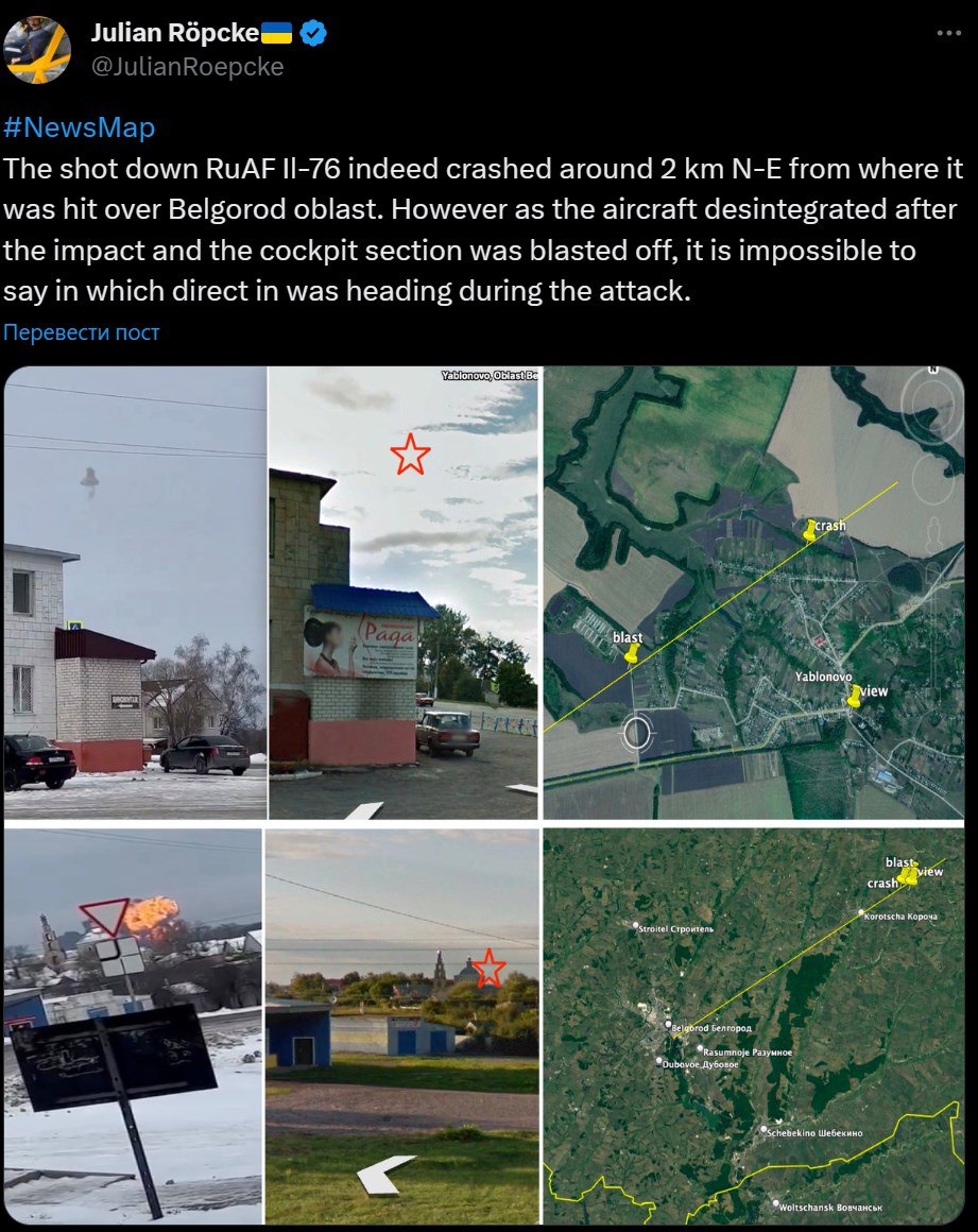 "Судя по небольшой высоте предполагаемого взрывного облака от удара ракеты, я бы скорее сказал, что самолет приближался к пункту назначения Белгороду, где нынешняя высота облака составляет всего 1300–1600 футов", - написал Репке.