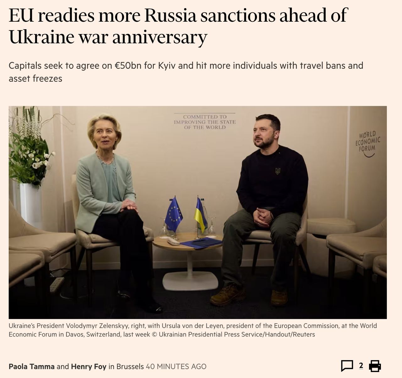13.40 ЕС хочет к второй годовщине вторжения РФ одобрить выделение Украине 50 млрд евро помощи, первые 5 млрд доходов от замороженных российских активов и 13-ый пакет санкций, пишет Financial Times.