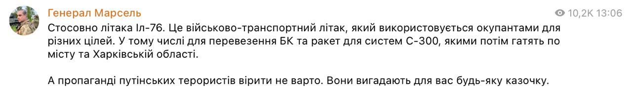 Мельник прямо не говорит, что самолёт сбили ВСУ, но обозначил его как "военно-транспортный самолет, который используется оккупантами для различных целей. В том числе для перевозки БК и ракет для систем С-300, которыми потом бьют по городу и Харьковской области".