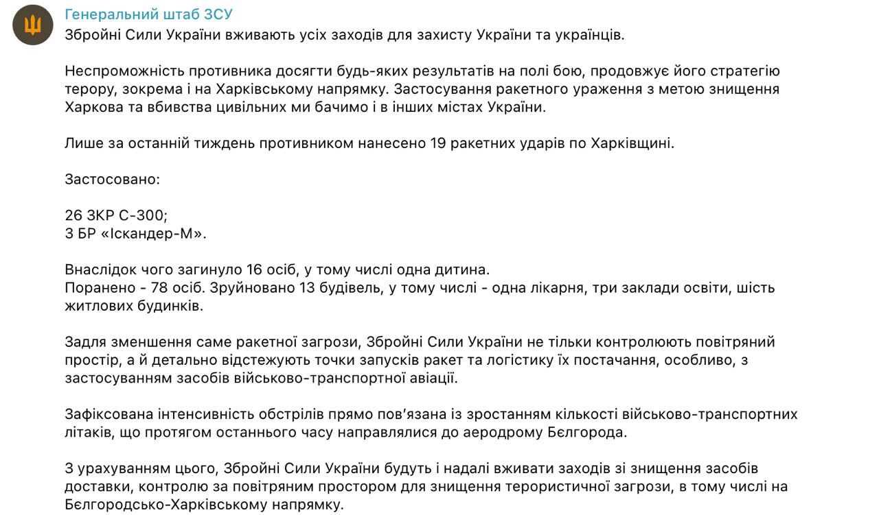 В сообщении указано, что РФ стала чаще обстреливать Харьковскую область за счет активизации поставок оружия авиацией в Белгород, а ВСУ отслеживают точки запусков ракет и логистику их поставки, особенно, с помощью авиации.