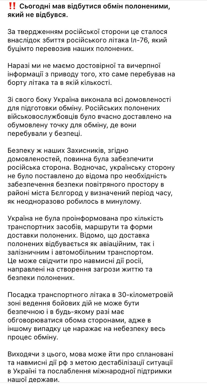 "Украина не была проинформирована о количестве транспортных средств, маршрутах и формах доставки пленных. Известно, что доставка пленных происходит как авиационным, так и железнодорожным и автомобильным транспортом. Это может свидетельствовать об умышленных действиях России, направленные на создание угрозы жизни и безопасности пленных. Посадка транспортного самолета в 30-километровой зоне ведения боевых действий не может быть безопасной и в любом случае должна обсуждаться обеими сторонами, ведь в противном случае это подвергает опасности весь процесс обмена", - говорится в сообщении.