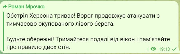 19:16 Херсон под обстрелом, сообщает глава города Роман Мрочко.