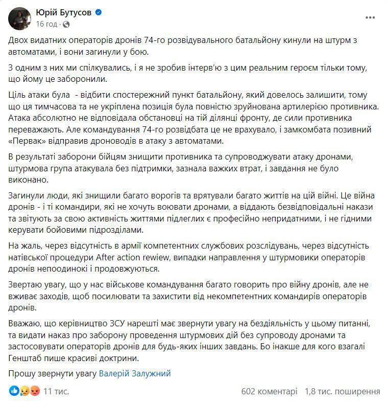 "В результате запрета бойцам уничтожить противника и сопровождать атаку дронами, штурмовая группа атаковала без поддержки, понесла тяжелые потери, и задача не была выполнена", - написал Бутусов.