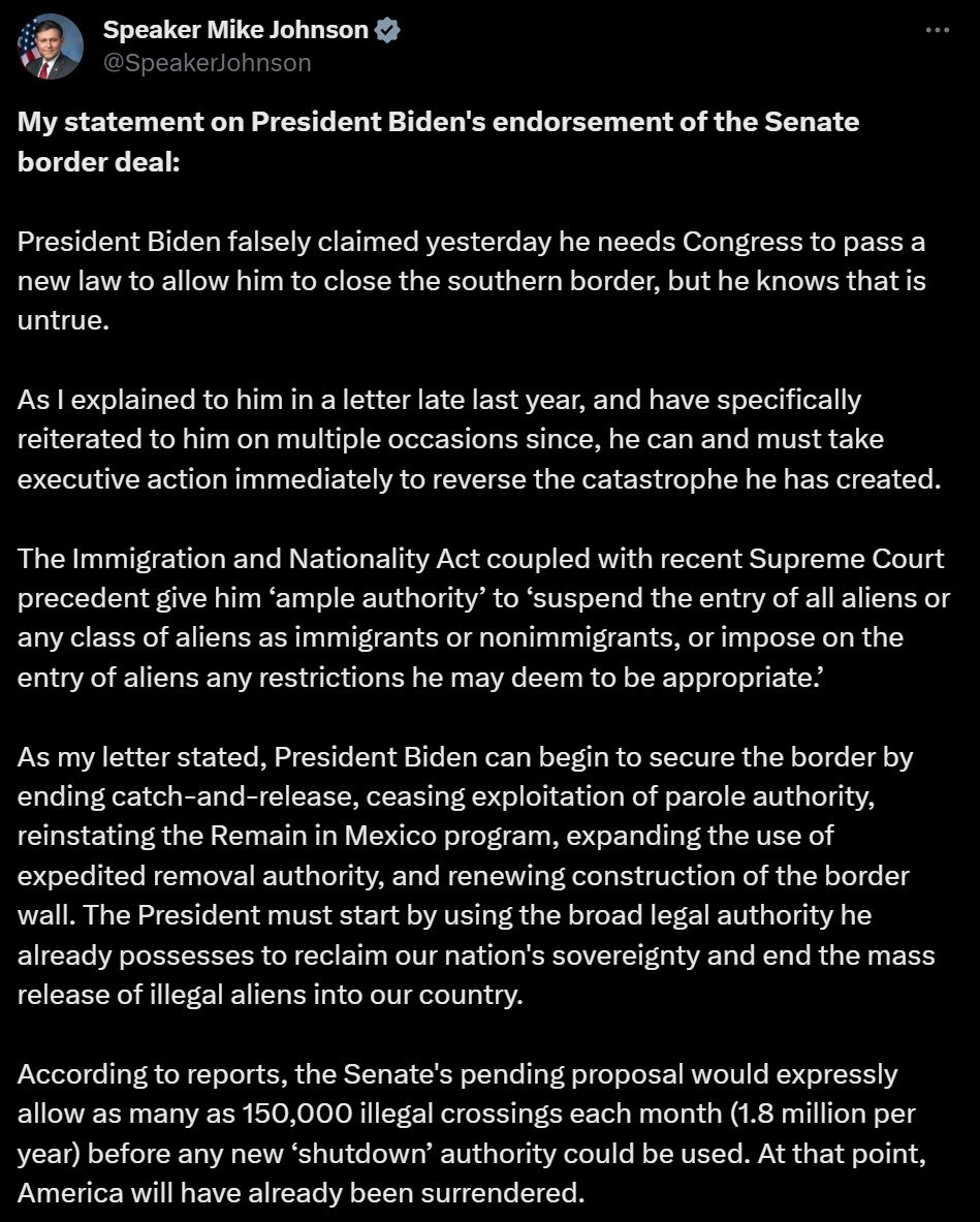 "Президент должен начать с использования широких юридических полномочий, которыми он уже обладает, чтобы восстановить суверенитет нашей страны и положить конец массовому пропуску нелегальных иностранцев в нашу страну", - заявил спикер.