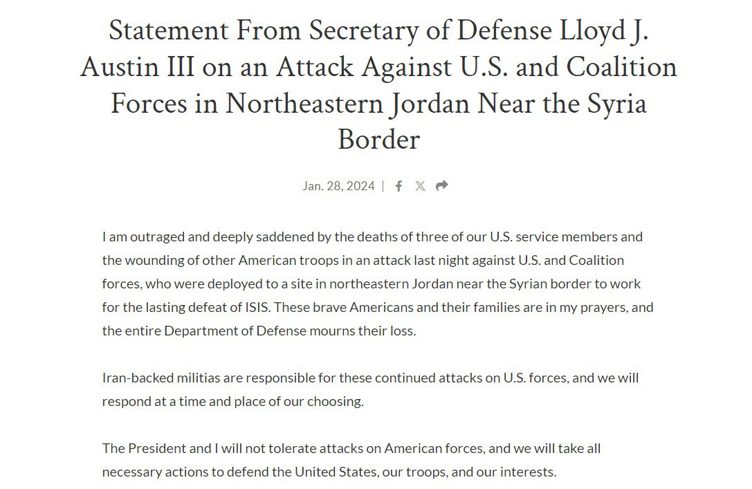 Также появилась реакция на атаку по базе США в Иордании главы Пентагона Ллойда Остина.