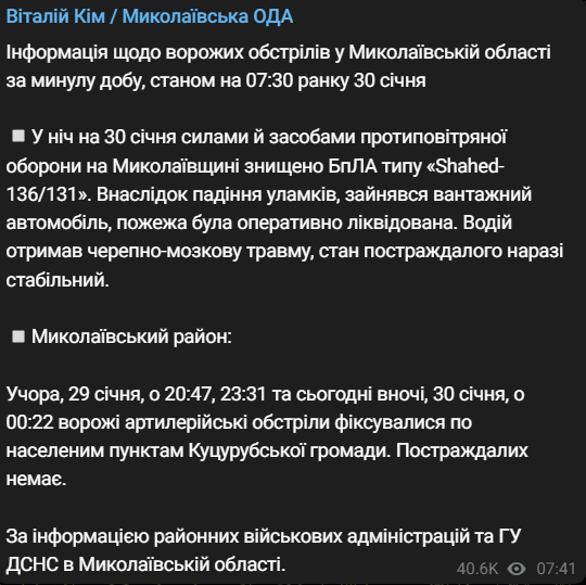 Также глава ОВА Виталий Ким сообщил, что в Николаевской области был уничтожен БПЛА типа "Shahed-136/131". В результате падения обломков, загорелся грузовой автомобиль, пожар был оперативно ликвидирован.