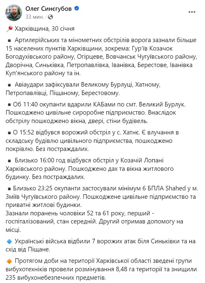 Об этом сообщает глава Харьковской ОВА Олег Синегубов.