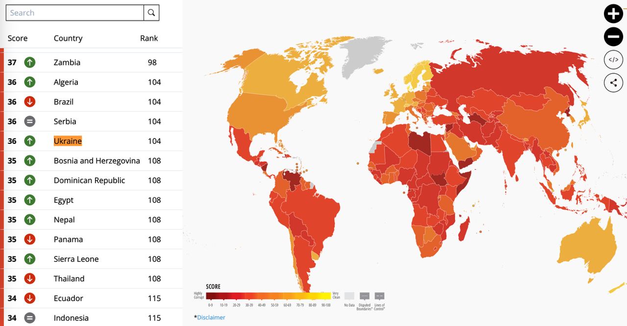 Украина заняла 104-е место из 180 стран в мировом рейтинге коррупции