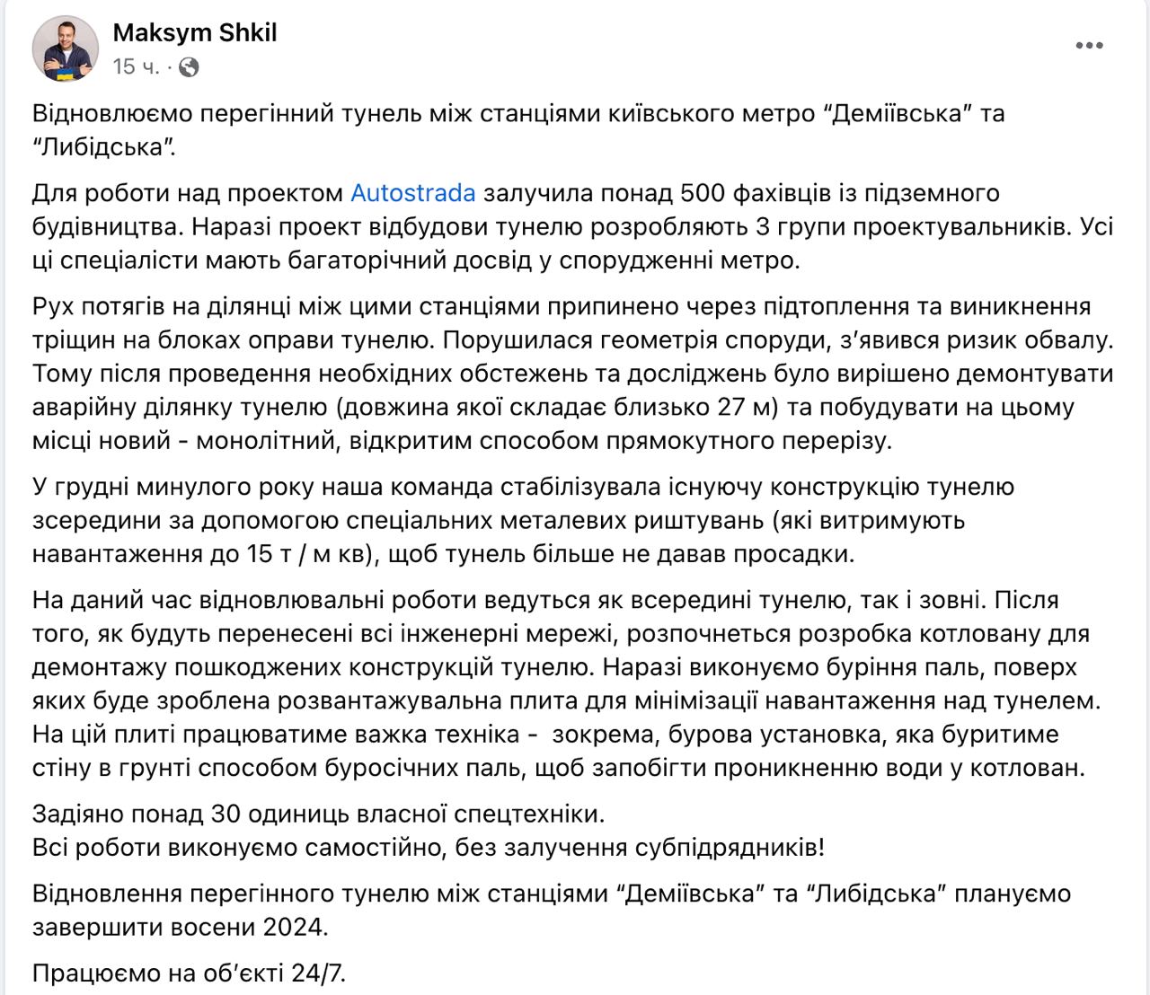 "После проведения необходимых обследований и исследований было решено демонтировать аварийный участок тоннеля (длина которого составляет около 27 м) и построить на этом месте новый - монолитный, открытым способом прямоугольного сечения", - написал он.