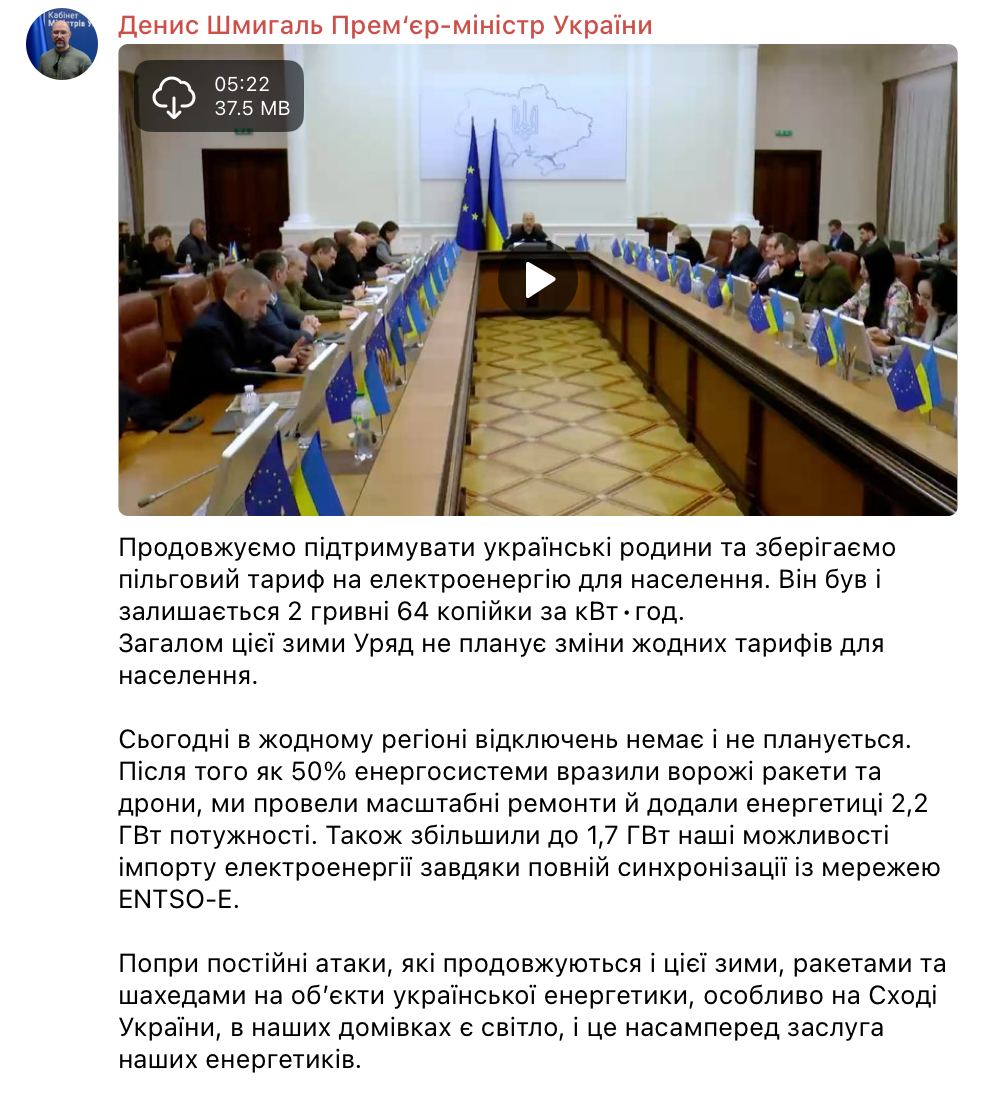 "Продолжаем поддерживать украинские семьи и сохраняем льготный тариф на электроэнергию для населения. Он был и остается 2 гривны 64 копейки за кВт⋅ч. В целом этой зимой правительство не планирует изменения никаких тарифов для населения", - заявил премьер Шмыгаль.