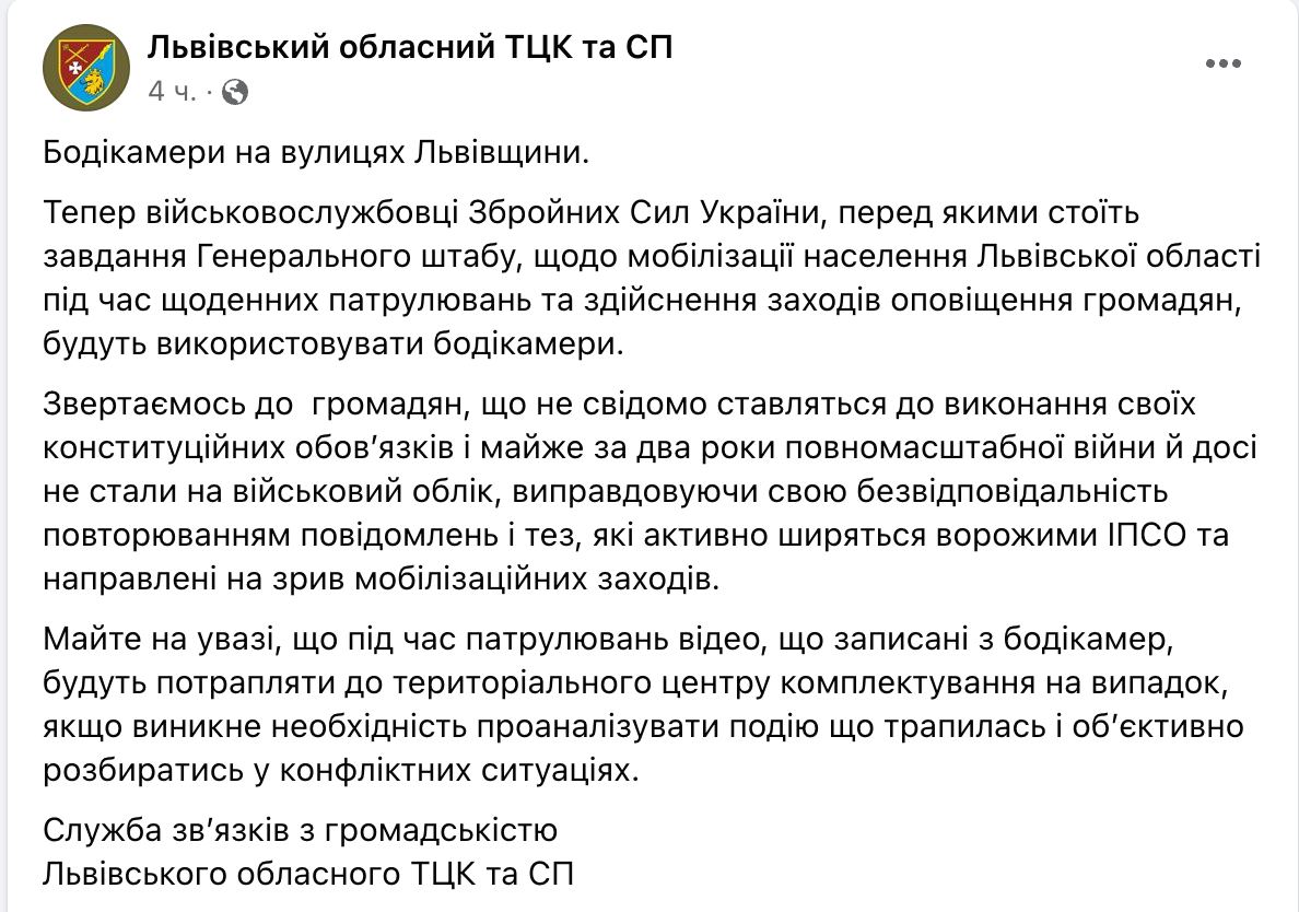 13.27 Во Львовской области военкомы теперь будут ходить с нагрудными камерами, сообщает областной ТЦК.