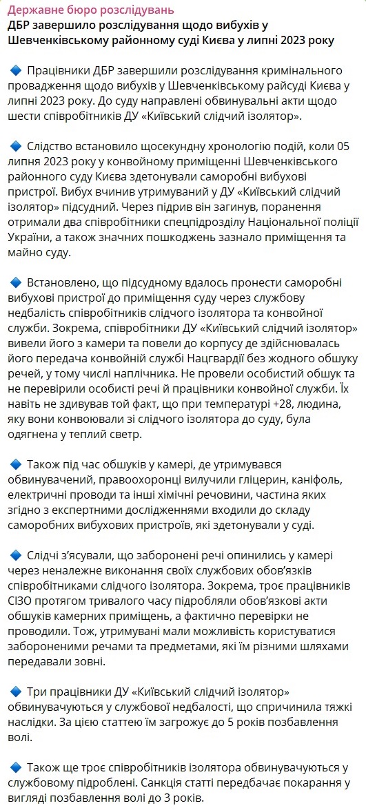 Шесть сотрудников Киевского СИЗО подозреваются в служебной халатности и подлоге, что позволило Гуменюку пронести взрывчатку в суд. Его не обыскивали и не проверяли личные вещи. Их "даже не удивило", что при температуре +28 Гуменюк был одет в теплый свитер.