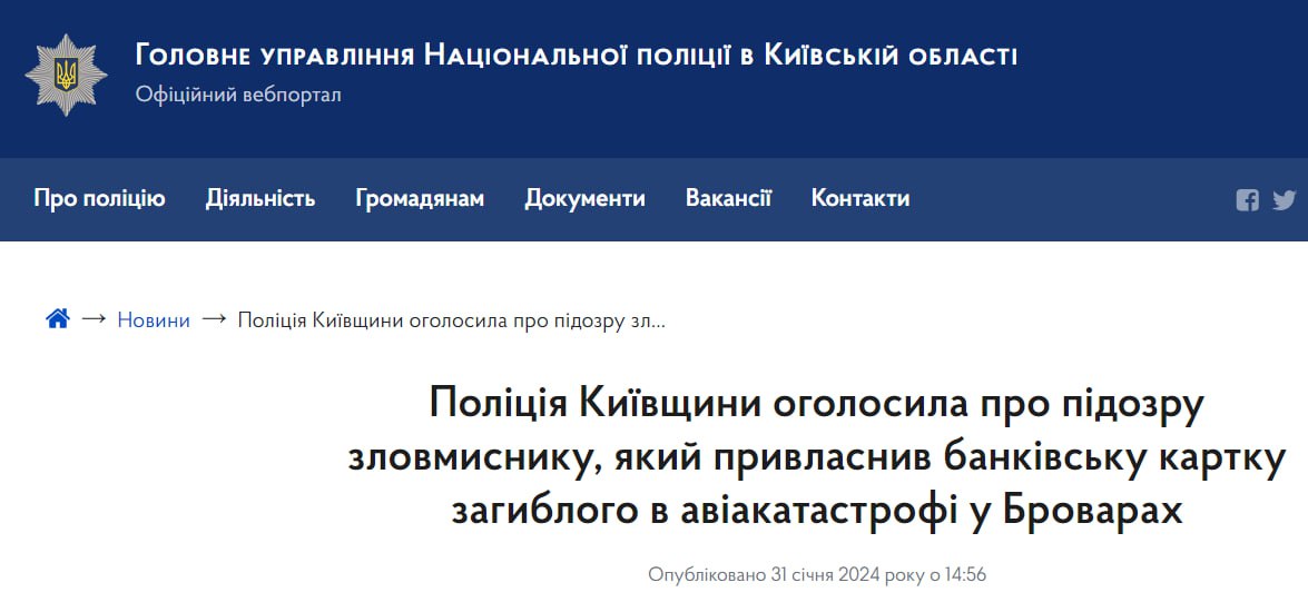 Житель Киевской области украл банковскую карту члена экипажа, погибшего в авиакатастрофе в Броварах.