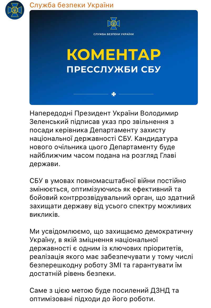 СБУ прокомментировала увольнение президентом руководителя своего Департамента защиты национальной государственности Романа Семенченко.