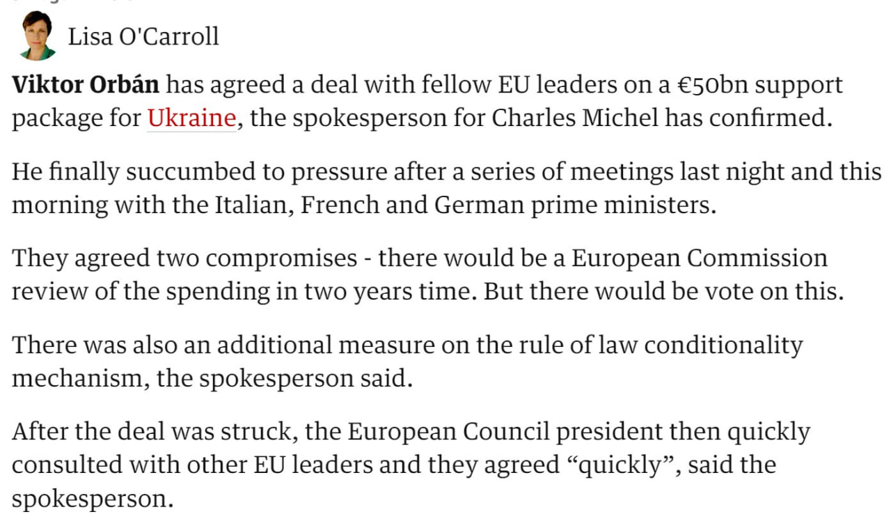 То есть, фактически, Орбан обменял свой голос за пакет помощи Украине, на размораживание европейских денег для Венгрии.