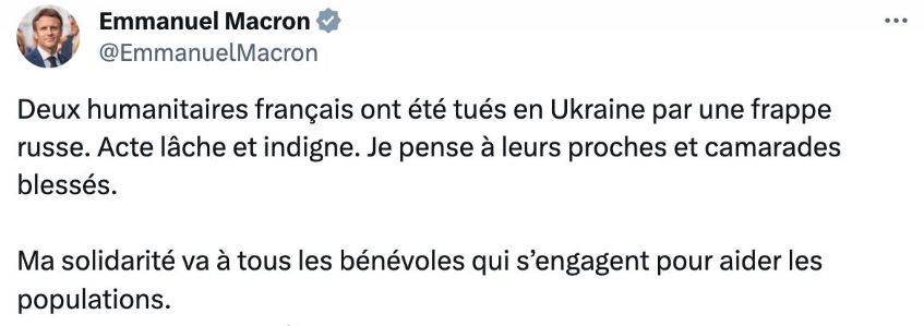 "Два французских гуманитарных работника были убиты в Украине в результате российского удара. Трусливый и возмутительный поступок. Я выражаю солидарность всем волонтерам, которые стремятся помочь людям", - написал президент Франции в соцсети Х.