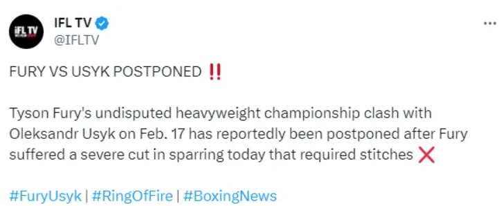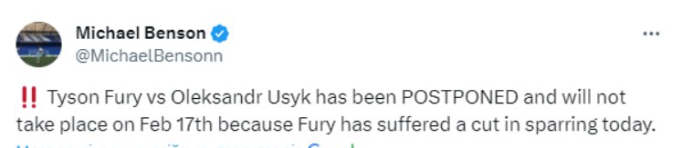 "Бой Тайсона Фьюри против Александра Усика перенесен. Он не состоится 17 февраля, поскольку сегодня Фьюри получил рассечение в спарринге", - написал Бенсон в социальной сети Х (ранее Twitter).