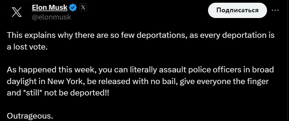 "Это объясняет, почему так мало депортаций, поскольку каждая депортация - это проигранный голос", - добавил миллиардер.